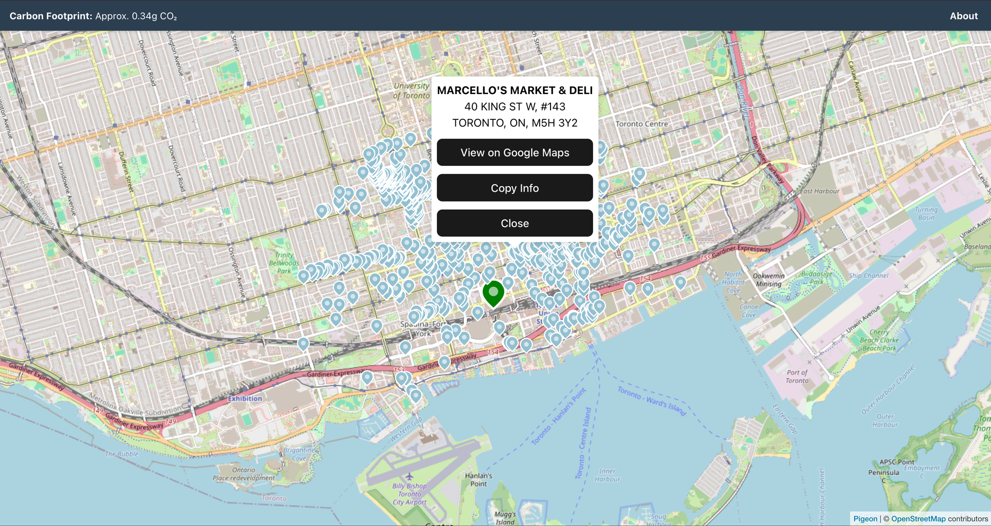 Once I got a map to render, I used either the user's location (retrieved via the Geolocation API on the browser) or a default of the coordinates of the CN Tower if the user didn't wish to provide their location.